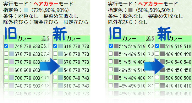 もう一つの例は灰色■(50% 50% 50%)です。旧バージョンではRGBの値が揃っていない、厳密には灰色と言えない色が2番目以降に表示されています。灰色の場合、色相は定義されませんが彩度が0であることに着目し、新バージョンでは彩度0の色をなるべく上位に表示するようになっています。今までは毎回検索し直す必要のあった、灰色同士のレシピの比較が行いやすくなりました。